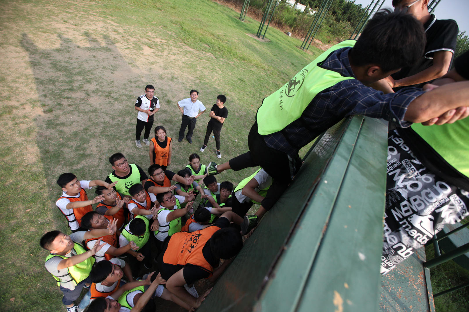畢業(yè)墻項(xiàng)目是最難的挑戰(zhàn),隊(duì)員們需要在不借助外部構(gòu)造的條件下全部爬到4.2米的高墻上,時間只有七分鐘。通過搭建“人梯”,隊(duì)員們一個個送了上去。隊(duì)員們沒有經(jīng)過專業(yè)訓(xùn)練,面對4.2米的高墻,墻下也沒有助力,最后一名隊(duì)員想要上去簡直太難了。墻上的隊(duì)員利用倒掛金鉤拉住墻下的隊(duì)員,大家都爆發(fā)了前所未有的力量,最后成功了,全體成員登上高墻,完成任務(wù)。宣布成功的這一刻,大家空前的團(tuán)結(jié),空前的感動,不拋棄,不放棄,才是一個真正的團(tuán)隊(duì)。