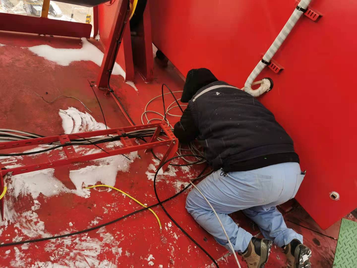 自2020年12月31日開始,為了追趕進度,我們團隊頂著冷風(fēng),放棄休息時間,把臂架到機房、司機室、電氣房的電纜敷設(shè)下來,進行捆扎。為了與船廠穿鋼絲錯開,吃飯的時間點總是往后推遲。甚至為了節(jié)省時間,自己提前帶好面包,中午簡單吃點,為的就是把工作搶一搶,看著已經(jīng)穿到位的電纜,不禁感嘆隊友們的拼勁兒。