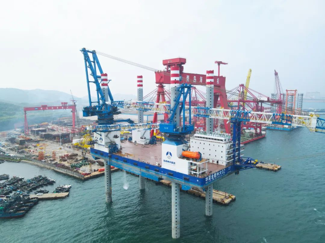 華夏金租神大02號(hào)1200噸風(fēng)電安裝平臺(tái)于2022年8月21日開工建造,2023年6月30日到達(dá)青島,2023年8月21日完成試航。到達(dá)青島海西后,項(xiàng)目組成員在01號(hào)平臺(tái)成功交付的基礎(chǔ)上,采取扎實(shí)有效的措施,狠抓生產(chǎn)組織與過(guò)程控制,僅用了不到3個(gè)月的時(shí)間就完成主輔吊機(jī)安裝、樁腿接樁、系泊試驗(yàn)、試航等主要工作,提前合同交貨期交船,向用戶交上了一份滿意的答卷。