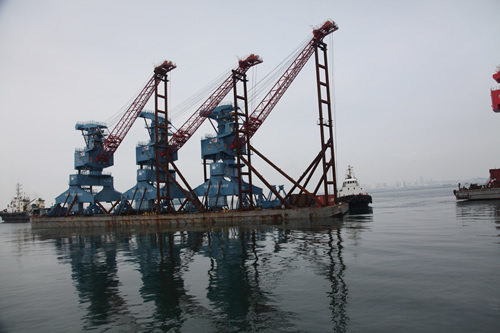 2012年8月17日,3臺(tái)單臂架門座式起重機(jī)(型號(hào):MQ25t-35m)離開(kāi)我司碼頭,駛向印尼第二港務(wù)集團(tuán)公司。